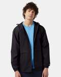 CHMPN ADT ANORAK ZIP JACKET. 2.8 oz., 100% polyester micro poplin Wind-and water-resistant Scuba collar with hood Adjustable bungie drawcord at hood and bottom hem Exposed dyed to match nylon coil zipper Lower front on seam pockets Set-in sleeves Encased elastic cuffs Champion C patch on left sleeve Woven neck label
